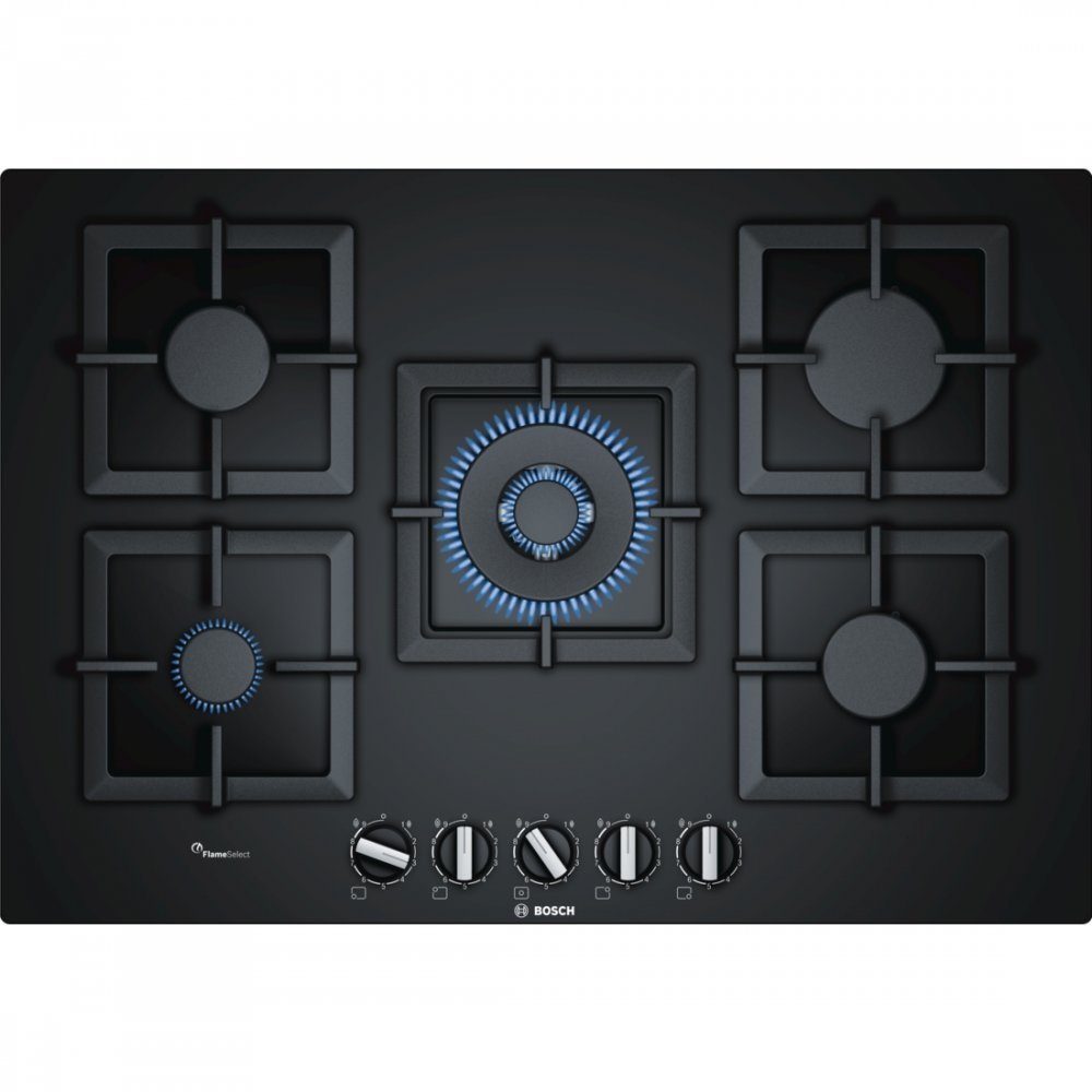 FlameSelect: pre presné nastavenie plameňa v deviatich stupňoch. Wok horák: výkonné varenie až 4 kW. Štandardná alebo zapustená inštalácia: vyberte si medzi zapusteným a vystupujúcim zabudovaním. Povrch z tvrdeného skla: elegantný design a jednoduché čistenie. Samostatné liatinové rošty: pre vysokú odolnosť a jednoduchú manipuláciu. 5 plynových horákov Wok horák 4x plyn + WOK (uprostred) vzadu vľavo: normálny horák 1.75 kW vzadu vpravo: silný horák 3 kW uprostred: horák Wok 4 kW vpredu vľavo: úsporný horák 1 kW vpredu vpravo: normálny horák 1.75 kW termoelektrická poistka zhasnutia plameňa rozmery spotrebiča VxŠxH(cm):4,5 x 75,2 x 52 farba:čierna