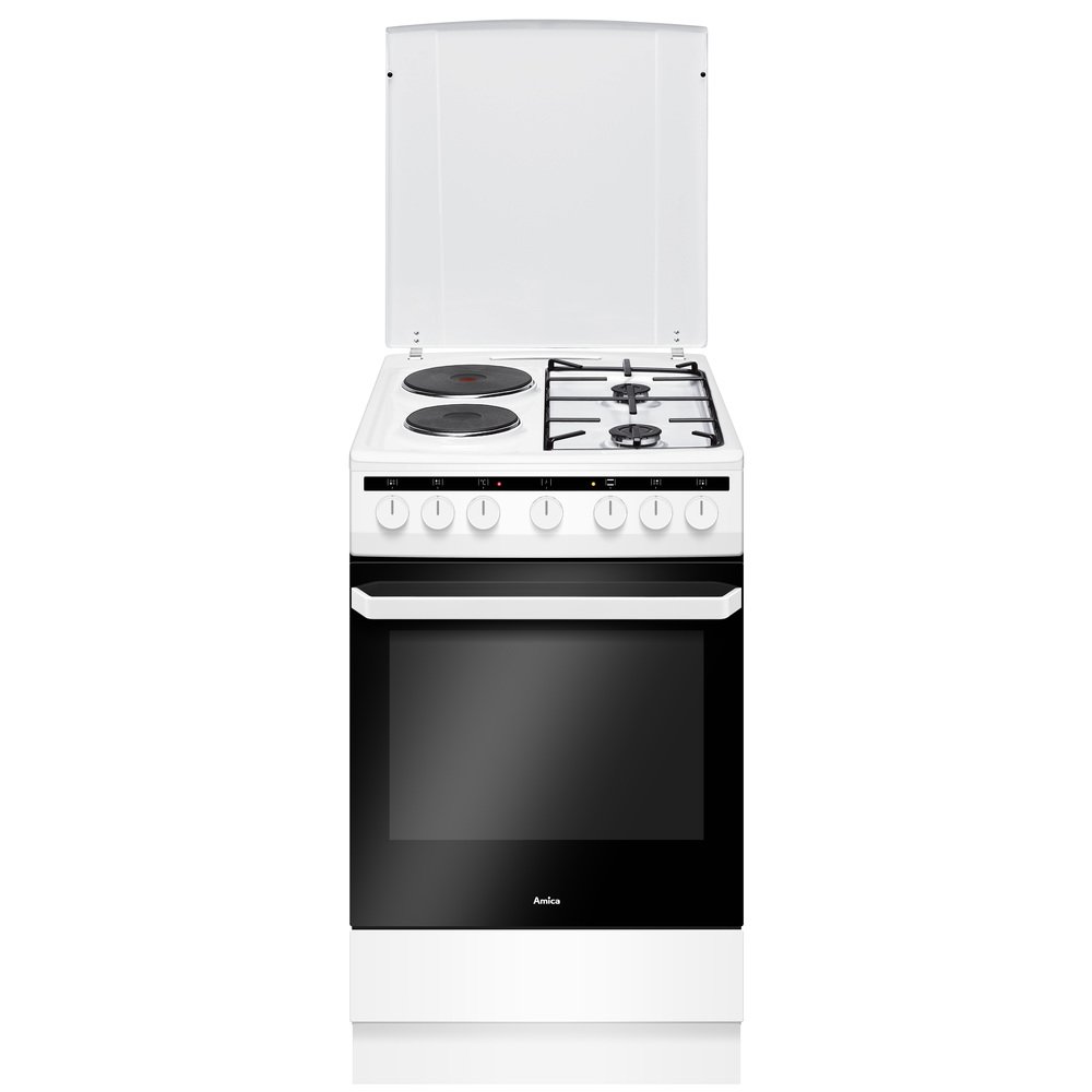 Farba Biela; Energetická trieda: A; Objem 62 l; Pripojenie k elektrickej sieti 400 V; Príkon 5,9 kW; minútka; Elektrická multifunkčná rúra; 8 funkcií rúry vr. grilu a ventilátora; Super rýchly ohrev; Bezpečnostné poistky horákov; Elektrické zapaľovanie v každom gombíku; Gril 2000 W; Horné výhrevné teleso 900 W; Spodné výhrevné teleso 1100 W; Ľahko čistiteľný smalt vo vnútri rúry; Počet skiel dverí rúry 3; Výsuvný odkladací priestor; Varná doska 2x plyn / 2x liatina; Samostatný stabilný smaltovaný rošt 1x; Malý horák 4 cm 1 kW 1x; Veľký horák 9 cm 2,8 kW 1x; Liatinová platňa 18 cm 2 kW 1x; Liatinová platňa 14,5 cm 1 kW 1x; Plytký plech na pečenie 1x; Rošt 1x; Poklop varnej dosky;