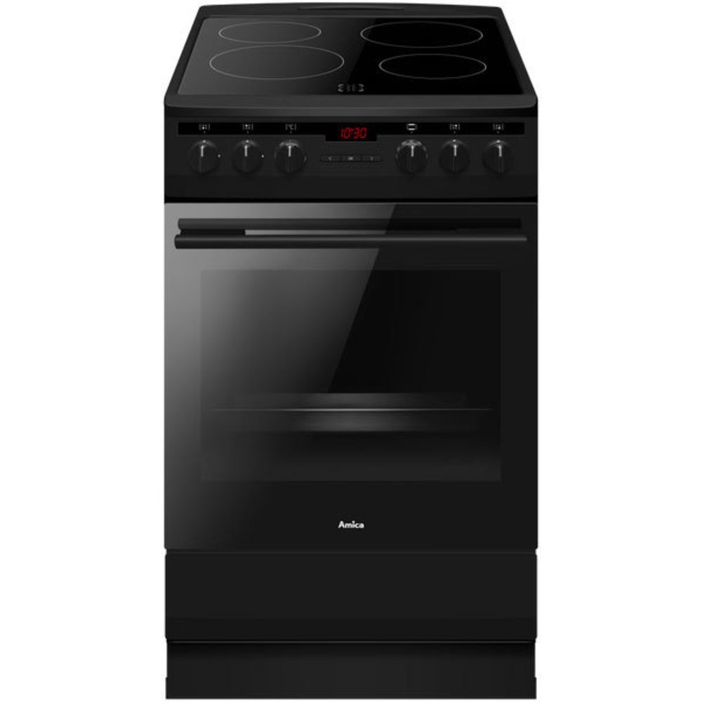 Sklokeramický sporák 50 cm; Farba Čierna matná; Energetická trieda: A; Objem 65 l; Pripojenie k elektrickej sieti 400 V; Príkon 9,6 kW; Digitálny displej / Typ programátora Tá; Elektrická multifunkčná rúra; 11 funkcií rúry vr. grilu a horúceho vzduchu; Super rýchly ohrev; Ukazovatele zvyškového tepla; Gril 1500 W; Horné výhrevné teleso 900 W; Spodné výhrevné teleso 1100 W; Zadné kruhové výhrevné teleso 2100 W; Bočné závesné lišty plechov; Ľahko čistiteľný smalt vo vnútri rúry; Počet skiel dverí rúry 3; Soft Close - tlmené dovieranie dvierok; Výsuvný odkladací priestor; Sklokeramická varná doska 4 zóny; HiLight zóna 14,5 cm 1,2 kW 2x; HiLight duálna zóna 18 cm 1,8 kW 2x; Hlboký plech na pečenie 1x; Plytký plech na pečenie 1x; Rošt 1x;